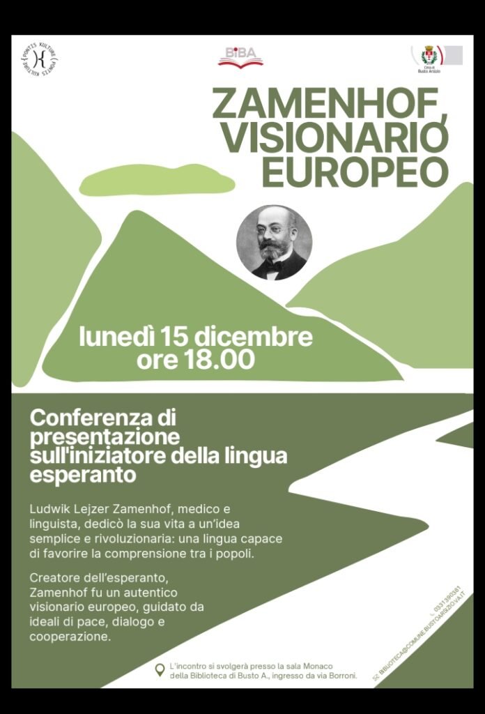Per una associazione culturale come la nostra, non c’è giorno migliore che iniziare l’attività pubblica se non il 15 dicembre. In tutto il mondo, infatti, tutte le comunità esperantiste ricordano e celebrano la nascita di Ludwik Lejzar Zamenhof, l’iniziatore della lingua.Noi, Pontis Kulture, lo faremo presso la sala Monaco della Biblioteca di Busto Arsizio con una conferenza che vi racconterà chi fosse questo visionario ed intellettuale europeo e a cosa ha portato il lavoro di tutta la sua vita. Vi aspettiamo tutti il 15 dicembre 2025 alle ore 18.